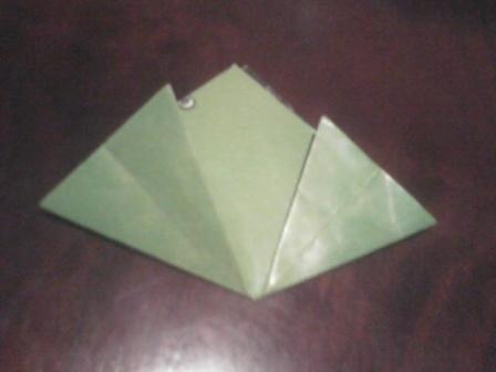 dobre as pontas de baixo para cima e em uma delas inverta a ponta para dentro de modo a criar a cabeça do tsuru;